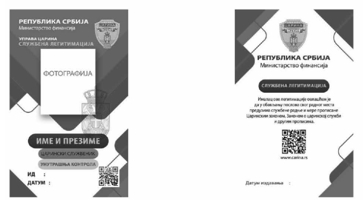Službenu legitimaciju ______________ (serijski broj kartice) carinskog službenika __________________ (ID broj službenika), izdatu dana ________________ godine.