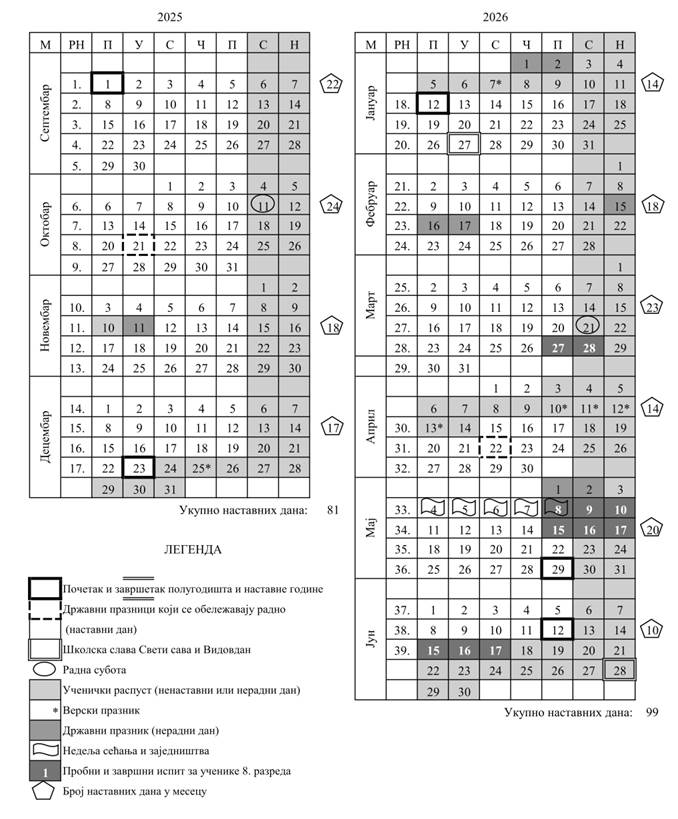 Kako bi se obrazovno-vaspitni rad realizovao u potrebnom broju nastavnih dana, uvode se dve radne subote i to, subota 11. oktobra 2025. godine, kada će se u svim školama, obrazovno-vaspitni rad realizovati po rasporedu časova za ponedeljak i subota 21. marta 2026. godine, kada će se u svim školama, obrazovno-vaspitni rad realizovati po rasporedu časova za petak.