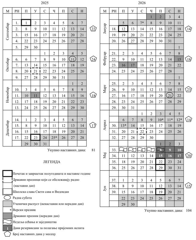 Kako bi se obrazovno-vaspitni rad realizovao u potrebnom broju nastavnih dana, uvode se dve radne subote i to, subota 11. oktobra 2025. godine, kada će se u svim školama, obrazovno-vaspitni rad realizovati po rasporedu časova za ponedeljak i subota 21. marta 2026. godine, kada će se u svim školama, obrazovno-vaspitni rad realizovati po rasporedu časova za petak.