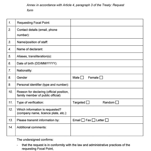 2. [General scope] The Treaty shall apply to an exchange of information irrespective of whether in particular the declaration system of the requested Party includes identical aspects of finances or personal interests, covers the same categories of declarants, uses the same procedures for verifying the veracity of a declaration, or foresees the same consequences as does the declaration system of the requesting Party.