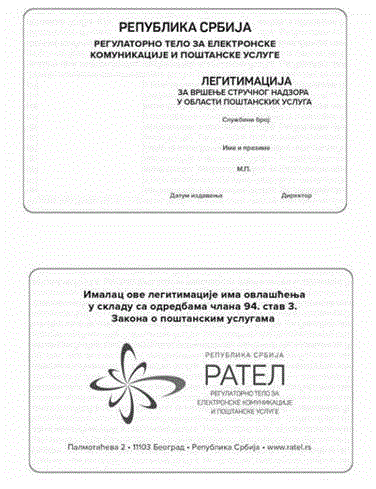 OBRAZAC LEGITIMACIJE OVLAŠĆENOG LICA ZA VRŠENJE STRUČNOG NADZORA U OBLASTI POŠTANSKIH USLUGA
