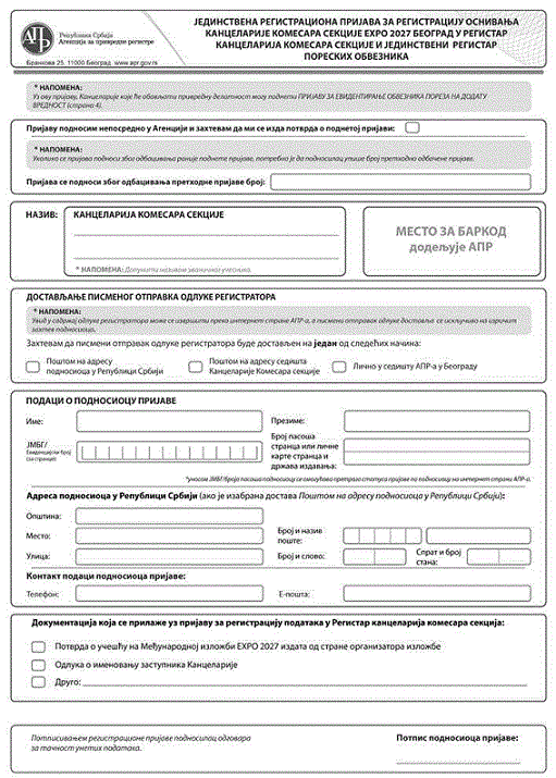 Registraciona prijava osnivanja Kancelarije podnosi se na obrascu - Jedinstvena registraciona prijava za registraciju osnivanja Kancelarije Komesara sekcije Expo 2027 Beograd u Registar Kancelarija Komesara sekcije i jedinstveni registar poreskih obveznika, koji je odštampan uz ovu uredbu i čini njen sastavni deo.