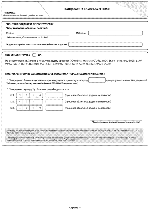 Obrazac registracione prijave osnivanja Kancelarije sadrži podatke iz člana 3. stav 1. tač. 1), 2), 3), 4) i 7) i stav 2. ove uredbe, zahtev za evidentiranje u Evidenciju obveznika poreza na dodatu vrednost, podatke o podnosiocu registracione prijave i o načinu dostavljanja rešenja registratora kojim je odlučeno o registracionoj prijavi.