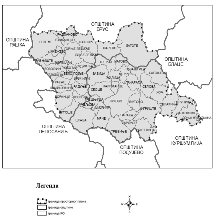 2. Okvirna granica izmena i dopuna Prostornog plana obuhvata delove teritorija opština Kuršumlija i Brus, i to: