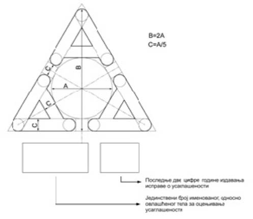 Srpski znak usaglašenosti se sastoji od tri velika slova A povezana u obliku jednakostraničnog trougla (3A), izgleda i sadržine kao na slici: