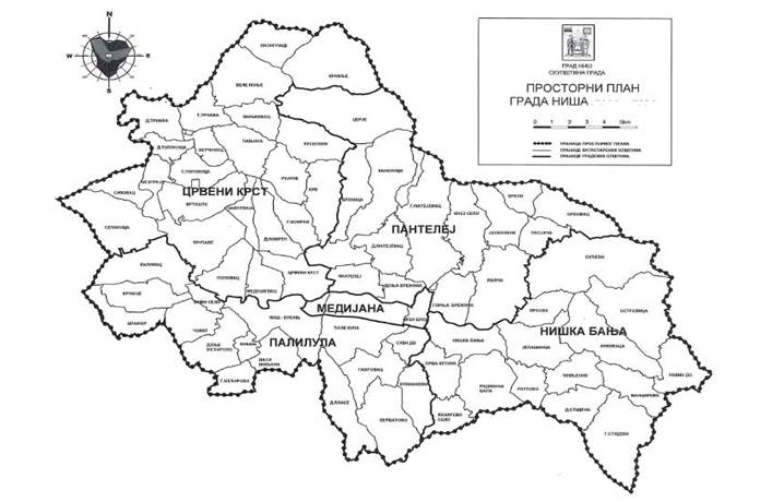 - Cele Katastarske opštine: Niš - Crveni Krst, Medoševac, Popovac, Donji Komren, Gornji Komren, Hum, Čamurlija, Trupale, Vrtište, Mezgraja, Gornja Toponica, Donja Toponica, Gornja Trnava, Donja Trnava, Berčinac, Paljina, Miljkovac, Rujnik, Leskovik, Vele Polje, Paligrace, Kravlje, Sečanica i Supovac.