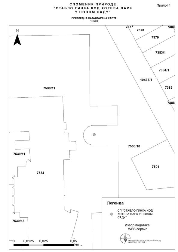 Parcelacijom parcele broj: 7530/1 KO Novi Sad I nastale su parcele broj: 7530/10 KO Novi Sad I i 7530/11 KO Novi Sad I, tako da se Spomenik prirode ne nalazi na parceli broj: 7530/11 KO Novi Sad I nego na parceli broj: 7530/10, KO Novi Sad I.