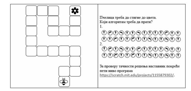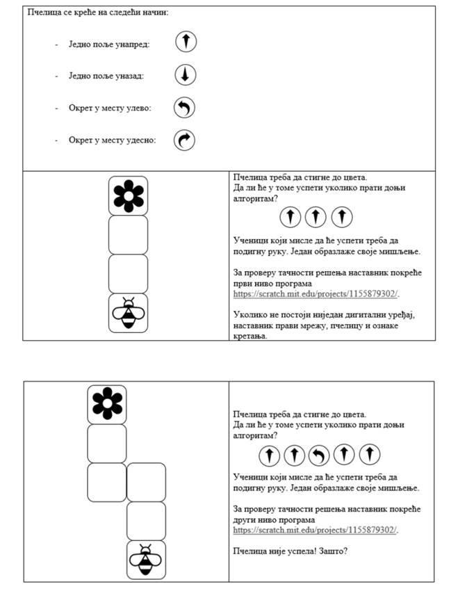 Ukoliko nastavnik ne raspolaže digitalnim uređajem, sasvim je prihvatljivo da se realizuju aktivnosti u kojima se instrukcije odnose na ponašanje učenika ili na predmet koji se ručno pomera. Poželjno je da ti algoritmi budu povezani sa nastavnim sadržajem drugih predmeta (matematika, maternji jezik i sl.). U nastavku je konkretan primer načina prikaza situacije i određivanja mogućih koraka.