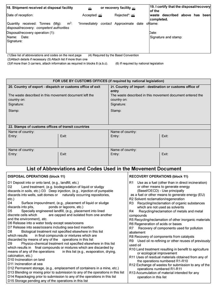 Polje 18: Ovlašćeno lice u postrojenju za tretman otpada u koje je upućena pošiljka potvrđuje prijem pošiljke svojeručnim potpisom, datum prijema pošiljke, količinu otpada koji je zaprimljen i operaciju tretmana koja je planirana.