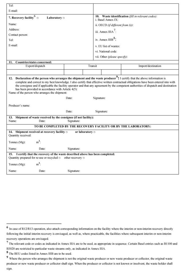 Polje 15: Podnosilac obaveštenja svojim potpisom potvrđuje da su podaci upisani u ovom prilogu tačni i potpuni, da su preuzete zakonski primenljive ugovorne obaveze i da prekogranično kretanje otpada jeste obezbeđeno svim potrebnim finansijskim garancijama. Ukoliko podnosilac obaveštenja nije generator otpada ovo polje potpisuje ovlašćeno lice iz polja 9.